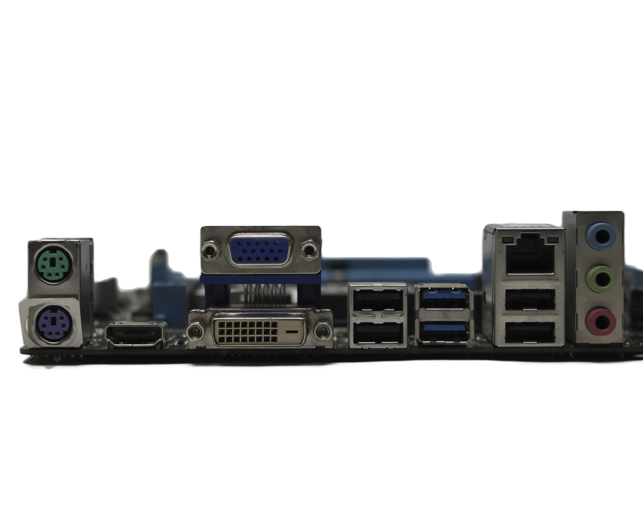 1x PS/2 (клавиатура ),1x PS/2 (мышь); 1x VGA, 1x DVI, 1x HDMI; 4x USB2.0; 2x USB3.0; 1x LAN RJ-45; 3x Audio jack |