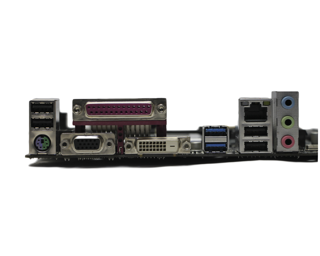 1x PS/2 (мышь или клавиатура); 1x VGA, 1x DVI; 4x USB2.0; 2x USB3.0; 1x LAN RJ-45; 1x LPT port IEEE 1284; 3x Audio jack |